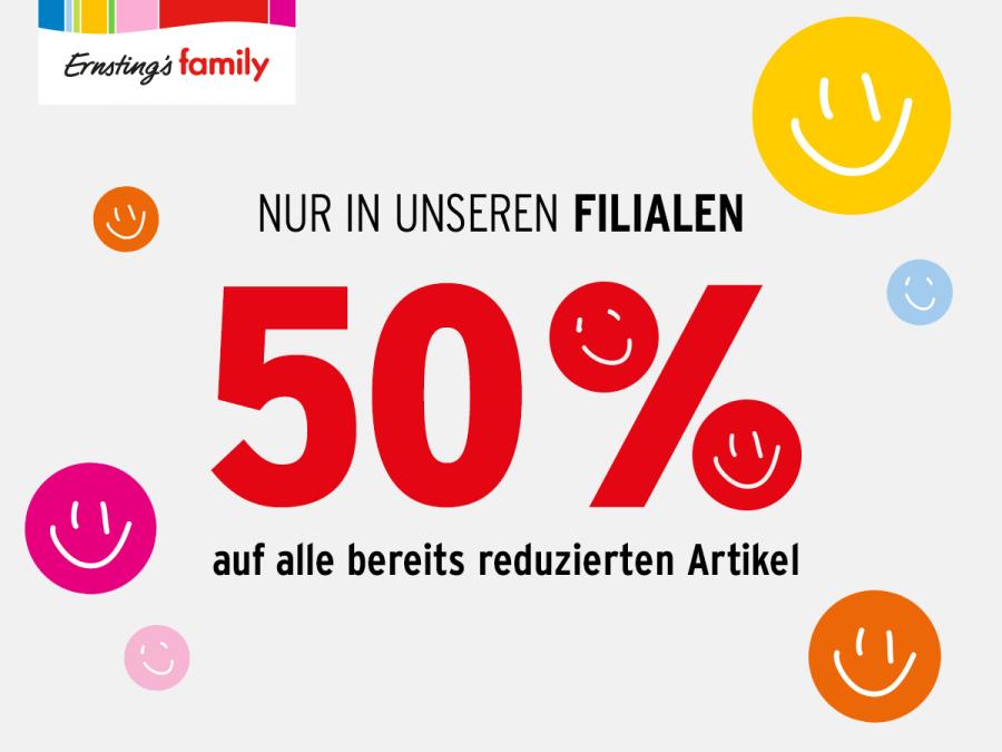 Bei Ernsting’s family gibt es 50 % auf bereits reduzierte Artikel. Die Aktion gilt ab 17.10 bis einschließlich 18.10.2025.